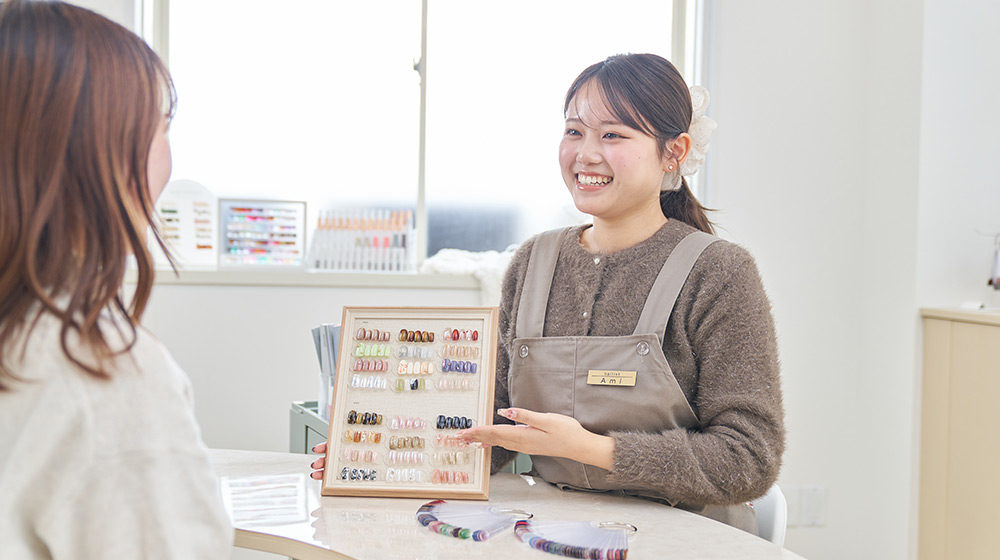 お客様の好みに「ドンピシャ」な提案ができ、「特別な日は絶対にお願いしたい」という言葉をいただけるたび、信頼されている誇りと喜びを実感します。キラキラした華やかな面だけではないけれど、自分なりの輝きを見つけられる最高のお仕事です。次は認定講師の資格取得を目指し、大好きなネイルの世界をさらに深めていきたいです!