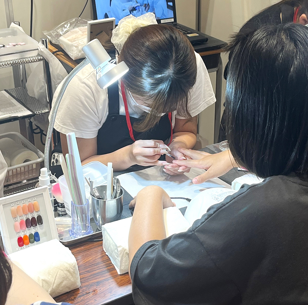 学生同士ではなく、初めての外部のお客様へのネイル施術でしたが、色味を自分から提案したり、会話と技術の同時進行をしている様子を見て、 ネイリストらしい姿に成長を感じました(*^^*)