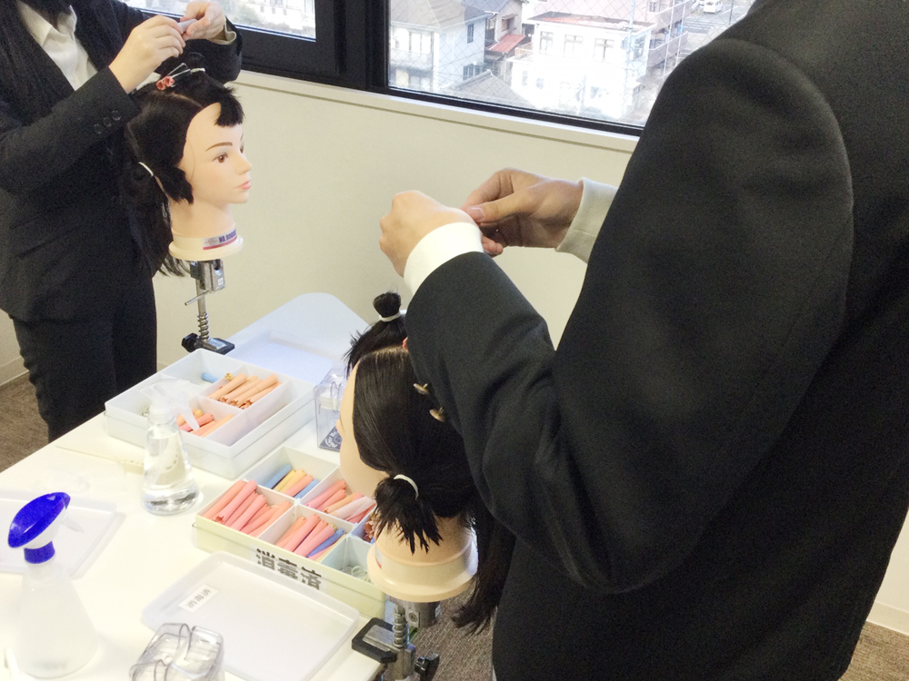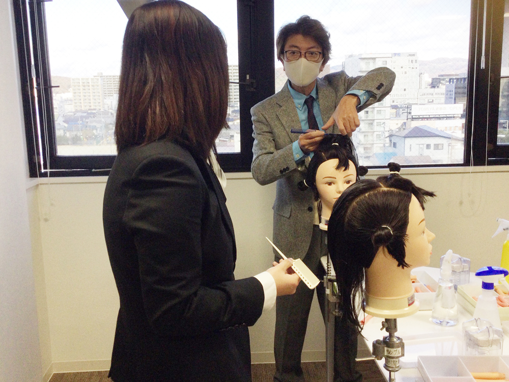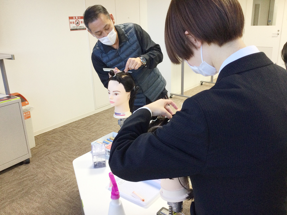 ヘアビューティ学科2年生のカットの授業の見学や、ワインディングの授業を体験していただきました。初めてのワインディングに苦戦しながらも、あきらめずに何度も繰り返し真剣に取り組まれていました。