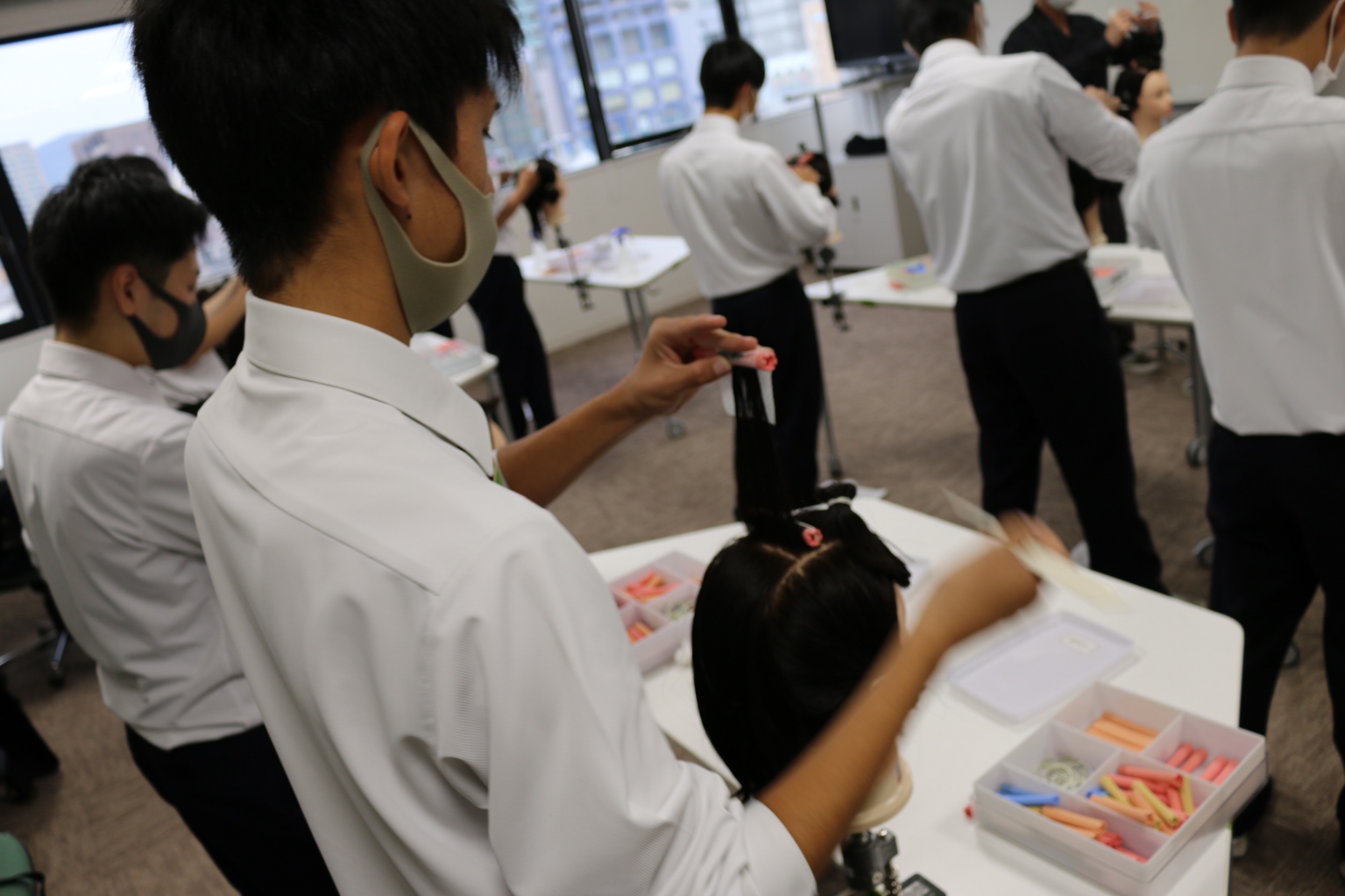 ヘアビューティ学科の体験授業では、初めてのワインディングに挑戦したり、在校生と一緒にヘアアレンジをしたりしていただきました。何度もやり直しながら繰り返し、楽しそうに在校生と話をする姿が印象的でした。