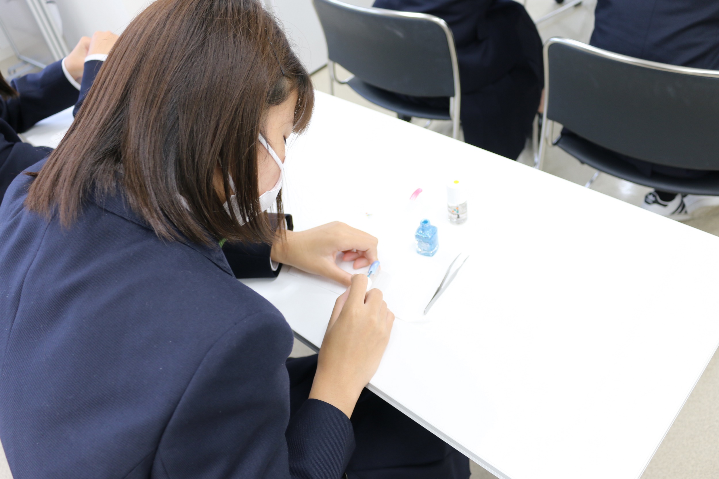 トータルビューティ学科の体験授業では、メイク、エステ、ネイルの業界の仕事について学んだ後、ネイルチップづくりに挑戦していただきました。グラデーションを作るのが難しい様子でしたが、シールも使いながら個々のデザインを完成させていました。